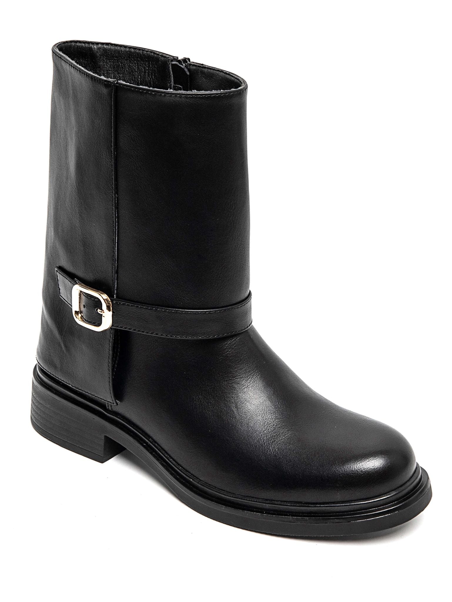 Este botín de polipiel combina elegancia y funcionalidad con su diseño cuidado, destacando los detalles de hebilla en dorado que aportan un toque sofisticado. El cierre de cremallera en el interior facilita su colocación y ajuste, garantizando comodidad durante todo el día. Perfecto para complementar looks urbanos con estilo y durabilidad.